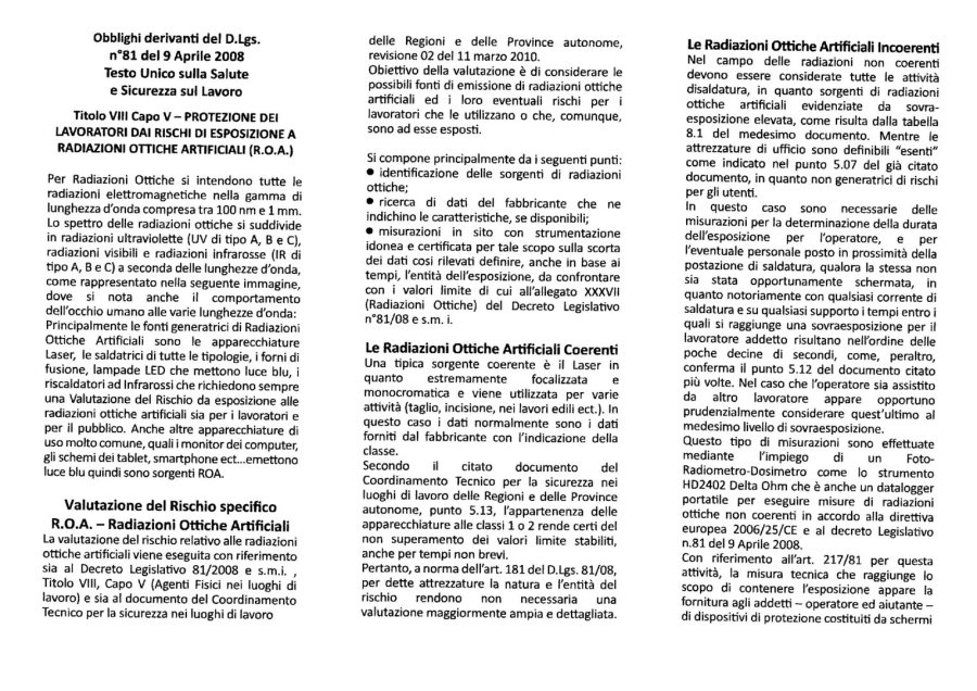 Nuova mini Guida, dopo quella sul Rischio CEM e sul RISCHIO Elettrico, sulla Valutazione del Rischio da Esposizione alle Radiazioni Ottiche Artificiali (R.O.A.) in riferimento al vigente D.Lgs. 81/08.